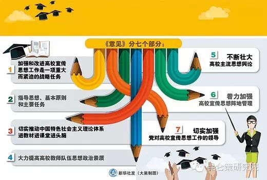 《意见》指出,要不断壮大高校主流思想舆论。强调要扎实推进高校思想理论建设,推进高校哲学社会科学创新体系建设,积极参与马克思主义理论研究和建设工程,加强中国特色社会主义理论体系研究中心等重点基地建设,建设和创办一批权威的马克思主义理论研究学术期刊,深入实施“青年马克思主义者培养工程”,在青年教师和学生中培养一大批政治骨干,造就一支政治坚定、学养深厚、有重要影响的思想理论建设队伍。要提升研究回答重大问题的能力,实施中国特色新型高校智库建设推进计划,定期开展师生思想政治状况调研,建立健全高校哲学社会科学研究分类评价体系,完善以质量和贡献为导向的评价机制。要加强哲学社会科学学术话语体系建设,组织开展高校名师大讲堂、理论名家社会行等活动,推动高校哲学社会科学“走出去”,支持中外学者围绕中国发展和全球性重大问题开展合作研究。要切实做好高校新闻宣传工作,完善新闻信息发布和新闻发言人制度,进一步改进高校新闻宣传的文风作风,建立高校、宣传部门、新闻媒体三方联动宣传机制,为高校改革发展营造良好舆论氛围。要创新网络思想政治教育,开展高校校园网络文化建设专项试点工作,大力推进校报校刊数字化建设,探索建立优秀网络文章在科研成果统计、职务职称评聘方面的认定机制,着力培育一批导向正确、影响力广的网络名师,立足校园网站建设开办一批贴近师生学习生活的网络名站名栏,建设一支由学生和青年教师骨干组成的网络宣传员队伍,打造示范性思想理论教育资源网站、学生主题教育网站和网络互动社区,推进辅导员博客、思想政治理论课教师博客、校务微博、校园微信公众账号等网络新媒体建设。