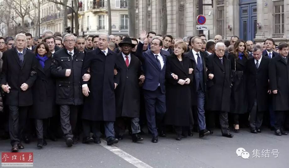 这是今年1月11日下午,法国总统奥朗德、德国总理默克尔等40余位国际政要在巴黎共和国广场举行大游行,悼念袭击中的遇难者,同时显示团结,共同反对极端主义时拍摄的照片。