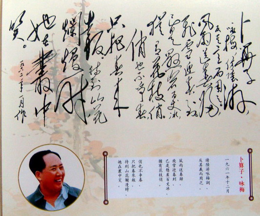 毛泽东的书法不物成规,有着极其鲜明的创新意识和鲜明的个性特征:他师古人而不拘成法,出新意于法度之中,寄妙理于豪放之外,推陈出新,独领风骚,从而形成了别具一格的“毛字”、“毛体”。