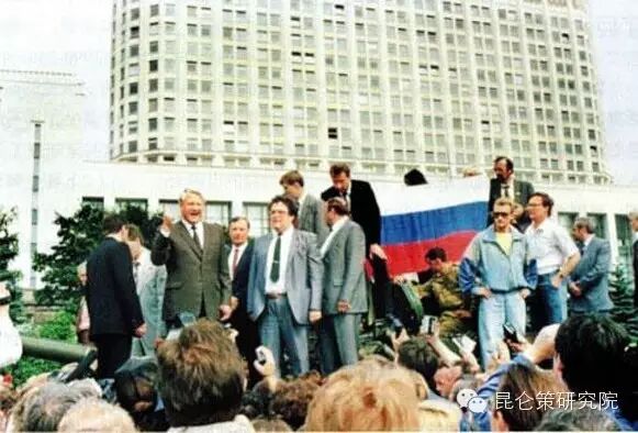 1991年8月19日,在莫斯科,俄罗斯总统叶利钦站在俄罗斯联邦大楼外的一辆坦克上,背后的支持者们撑起了一面俄罗斯国旗,叶利钦向他的支持者发表演说,呼吁他们进行大罢工。(法新社/黛安路Hovasse)