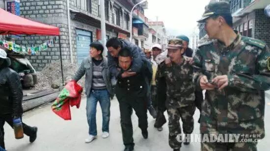 西藏吉隆边检站在紧急转移日喀则市吉隆县吉隆镇在地震中受伤群众和年老群众。(亚洲新闻图片网/郑永波 摄)