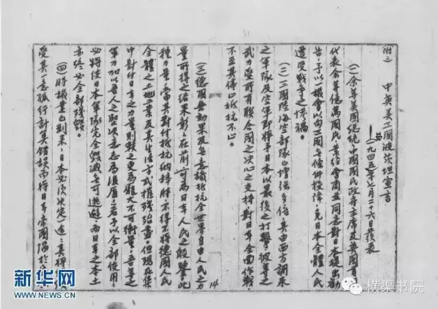 (一)余等美国总统、中国国民政府主席及英国首相,代表余等亿万国民,业经会商并同意对日本提出劝告,予以一机会以向三国无条件投降,免日本全体人民遭受战争之惨祸。