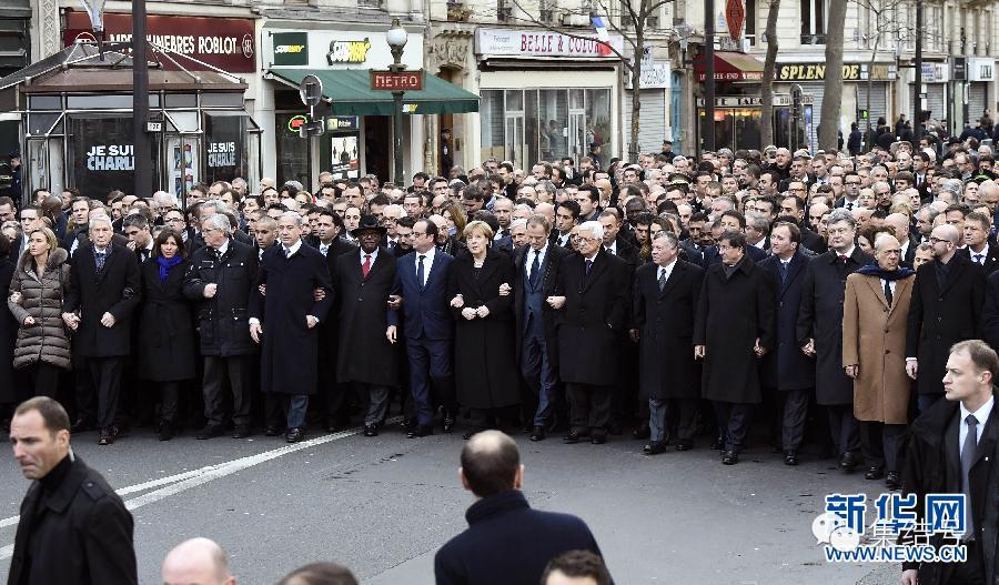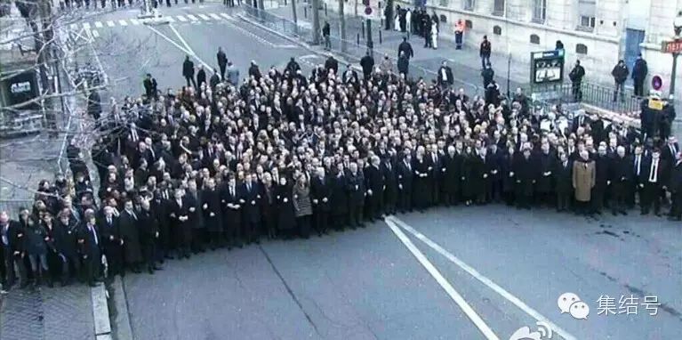 这是今年1月11日下午,法国总统奥朗德、德国总理默克尔等40余位国际政要在巴黎共和国广场举行大游行,悼念袭击中的遇难者,同时显示团结,共同反对极端主义时拍摄的照片。