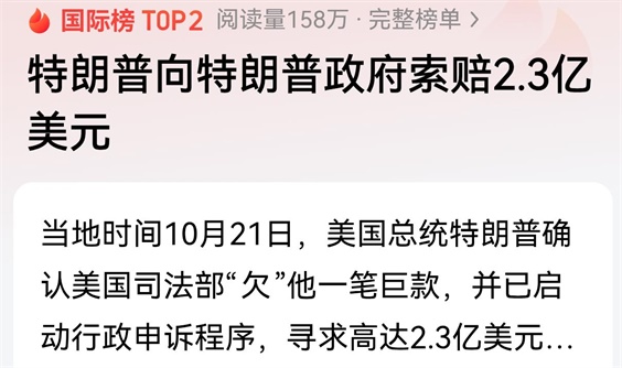 另外两件事,则非常搞笑:其一,特朗普夏梦特朗普政府索赔2.3亿美元,这真有点美国,更有点特朗普,我们根本无法理解,尽管美国人都质疑,“这还是美国总统吗?”可特朗普就在这里,从内部摧毁美国;其二,特朗普不满自己是“全美第三好总统”,这的确完全是好大喜功的特征。