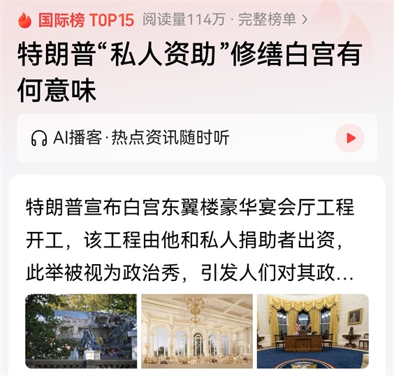 但想一想,连130万美军的薪水,特朗普也宣称有超级富豪资助,被戏称为“军队私有化”。特朗普的确内外交困了。这次白宫要修一个特朗普版超豪华宴会厅,因此拆了白宫原有的建筑,有着特殊的意味,不是仅仅修缮房子那样简单。