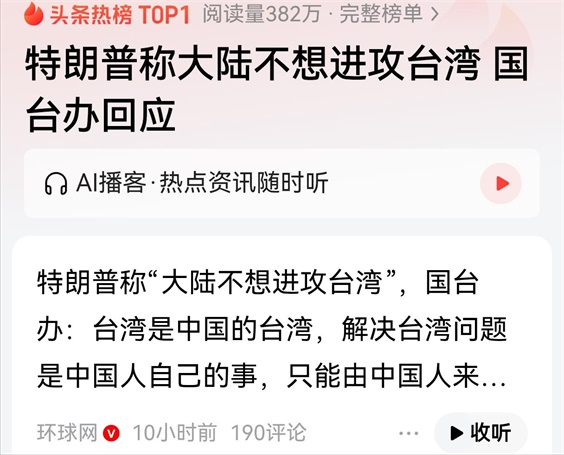 其二,特朗普急于寻求与中国关系突破。在中美贸易战上宣布达成协议,在台湾问题上说中国不想进攻台湾,这都是中国核心利益,特朗普如此急不可待,说明实在硬怼不过中国了,妥协心态已经显现,特朗普估计也知道“攘外必先安内”这句话,需要一个外交突破,来碾压国内反对派。