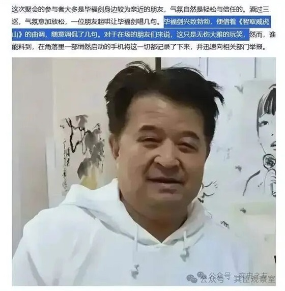 其一,毕某人只是“随意调侃了几句”吗?文章中作者故意地轻描淡写地说,毕-福剑在私人饭局上唱《智取威虎山》,兴致勃勃,便借着《智-取威-虎山》的曲调,随意调侃了几句。对于在场的朋友们来说,这只是无伤大雅的玩笑。